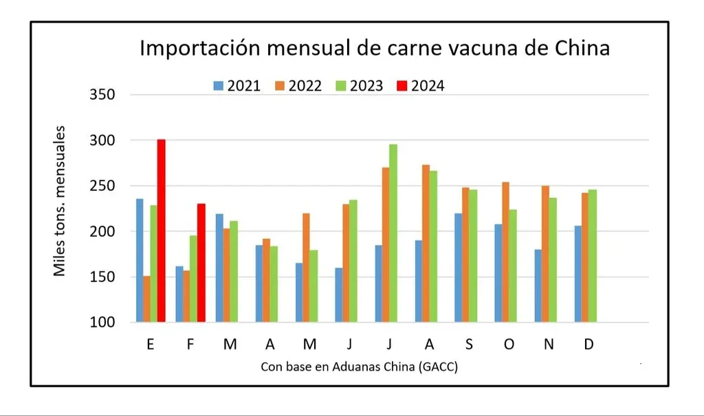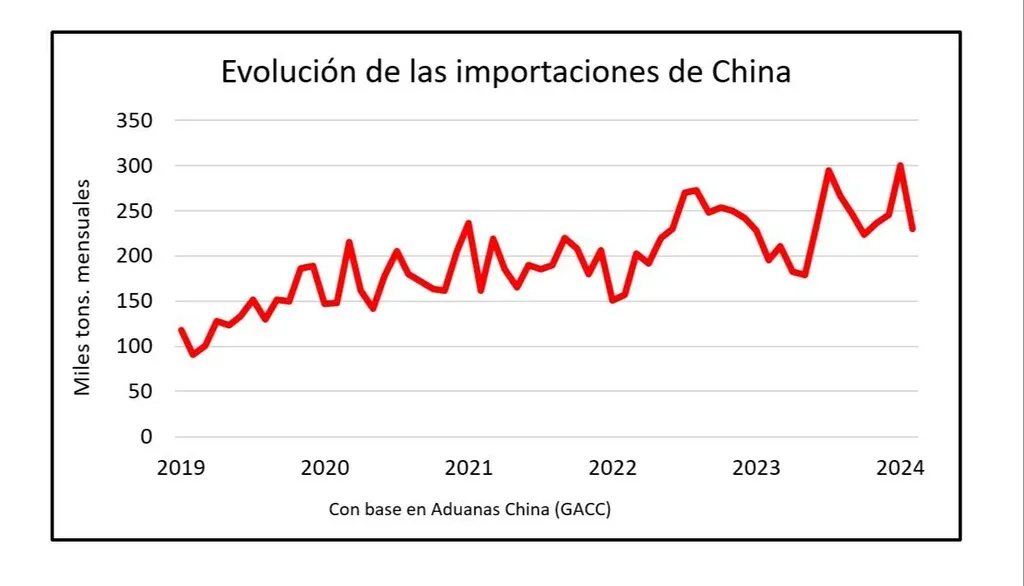 Pese a las previsiones bajistas del USDA y las más cautelosas del MLA, China arrancó el año a toda máquina. En enero importó un volumen mensual récord de 300 mil toneladas (superó las 295 mil de julio de 2023) y en febrero alcanzó un nuevo máximo para ese mes con 230 mil toneladas, según las cifras de la Administración General de Aduanas de China (GACC).