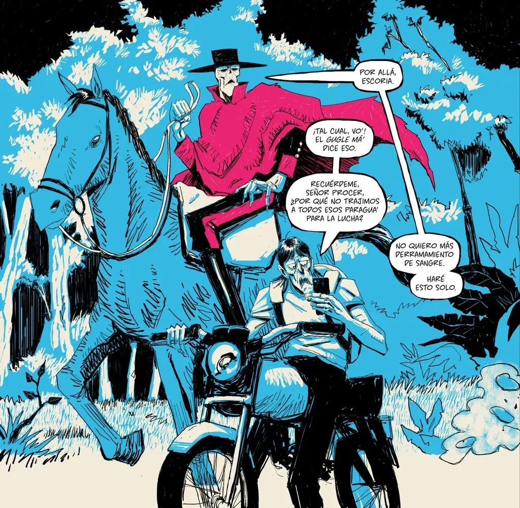 Andrés Silva: La gracia del proyecto es que a medida que nos íbamos sumergiendo en la historia e investigando, íbamos encontrando a otras personas que estaban involucradas con Artigas pero desde otro lado, como nos pasó con los tres prologuistas: Leonardo Borges, el semiólogo Fernando Andacht y Martín Atme, el fotógrafo que hizo un proyecto sobre Artigas. Encontrar esas asociaciones y juntarnos con ellos nos enriqueció para seguir solidificando el universo de Prócer Zombie. Con otro libertador eso no te sucedería. Perdería esa gracia y el chiste local. Desde un lado más mercenario, más comercial, es contraproducente porque tenés una frontera, no va a trascender del Río de la Plata y como mucho el sur de Brasil. Salvo que lo hagas de una forma más neutra. Que se fue neutralizando, se puede entender en cualquier lado, pero tiene más sentido acá, que conocemos la mitología y la repetición del prócer por todos lados. Leo quedó copado y contento con la invitación. En un momento también nos contactamos con Ana Ribeiro, que le gustó y le parecía interesante la irreverencia.