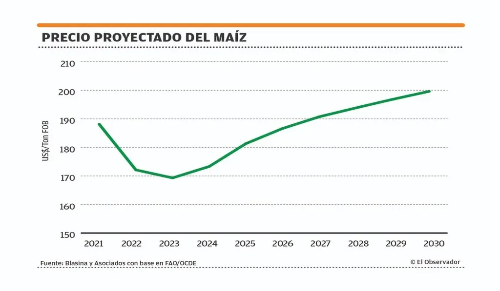 Se espera que estos precios bajen a los promedios históricos en los próximos tres años, hasta US$ 169/tonelada, para volver a la senda alcista a partir de 2023. Y el maíz recién volvería a tocar los US$ 200 para 2030.