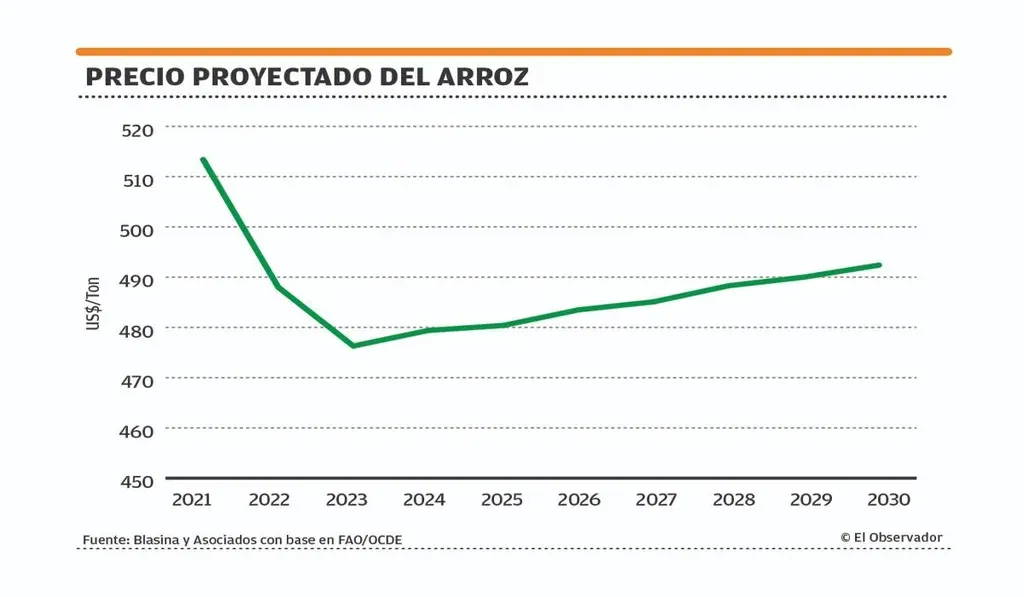 El arroz no conseguirá mantener los precios que obtuvo en 2020 –OCDE y FAO usan una referencia de US$ 512 por tonelada, el nivel más alto desde 2013– y bajará a US$ 488 para 2022 y a US$ 476,3 en 2023. Desde entonces se recuperará lentamente, a un ritmo anual de menos de 0,5%, para alcanzar los US$ 492 por tonelada en 2030.