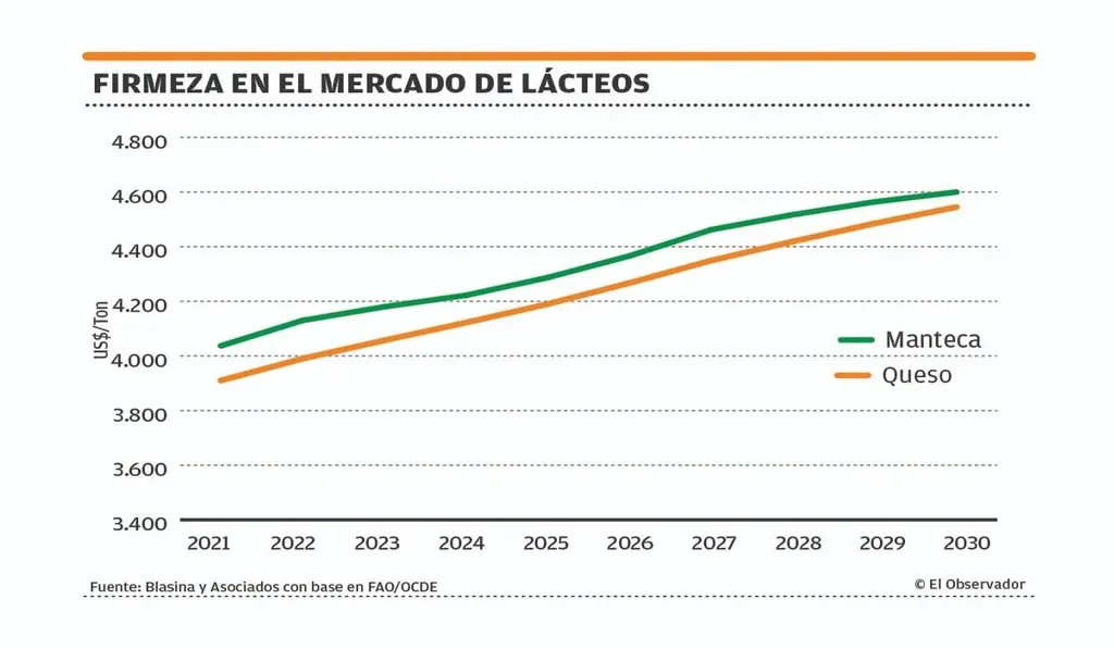 En materia de precios, la manteca subiría de US$ 4.037 la tonelada en 2021 a US$ 4.600 en 2030, un incremento de 14% que se acelera entre 2025 a 2027 y volverá a ralentizarse a partir de 2028. En el queso la trayectoria es más constante para un incremento acumulado de 18,3%.