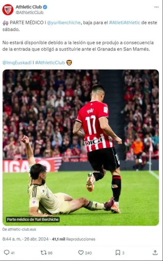 “El jugador Yuri Berchiche causa baja debido a una lesión traumática en la arteria tibial posterior como consecuencia de la contusión producida en su tobillo derecho por la entrada recibida en el partido Athletic-Granada, que obligó a sustituirle en el minuto 70”, dice el comunicado.