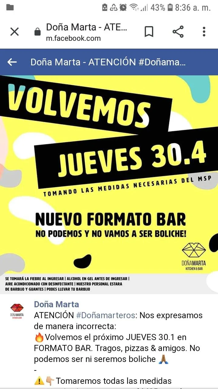 Facebook Doña Marta En la noche del sábado, Doña Marta llegó a ser tendencia en Twitter por los cuestionamientos de los usuarios hacia la decisión de reapertura del establecimiento. Entre las bromas, la preocupación por el contagio de coronavirus y la condena, todos los aspectos de la decisión fueron criticados. Muchos aludían a lo desaconsejable de que un local bailable reabriera sus puertas, y algunos se centraban en medidas particulares anunciadas como la de contar con "aire acondicionado con desinfectante".