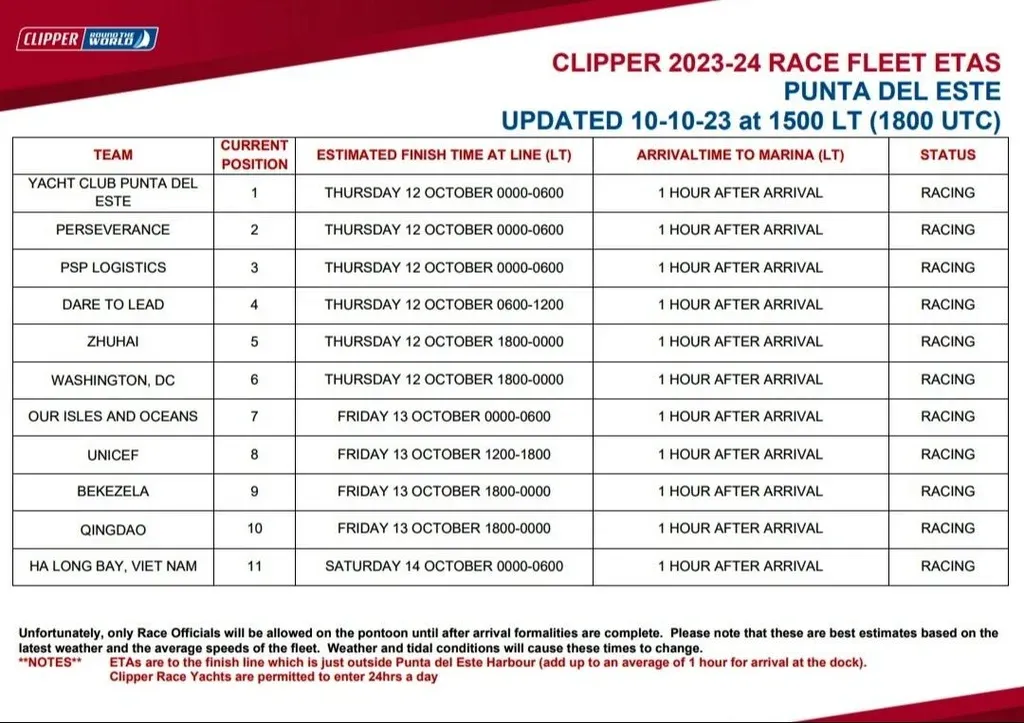 La flota de la Clipper Race llegará a Punta del Este a partir del 12 de octubre de 2023, con una gran bienvenida y un completo programa de escalas en el que se celebrarán los 100 años del YCPE. El 22 de octubre, los equipos partirán de la ciudad para correr hacia Ciudad del Cabo, Sudáfrica.