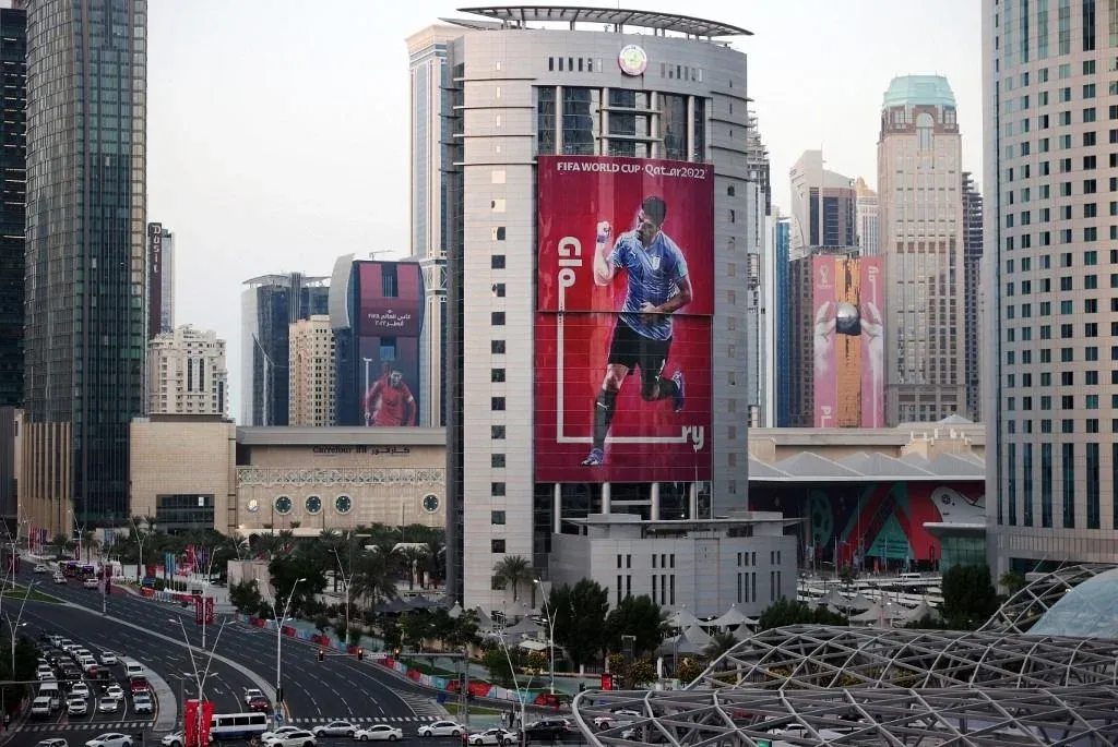 Una imagen gigante del delantero de la selección uruguaya Luis Suárez, erigida a lo alto de un edificio, brilla en la noche de Doha en el marco del Mundial de Qatar 2022.