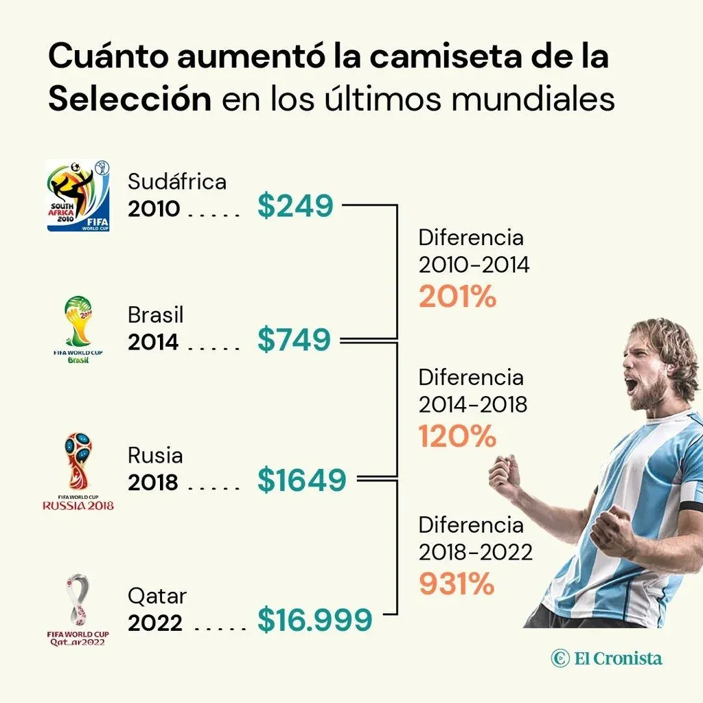 En relación a la indumentaria, de acuerdo al relevamiento, en Sudáfrica 2010, la camiseta de la selección argentina costaba A$ 249. En mundial de Brasil 2014, saltó a A$ 749. Es decir, aumentó un 201% de un mundial a otro. En Rusia 2018, la indumentaria albiceleste original costaba alrededor de A$ 1.649, un 120% más que en la edición anterior. Y así llegamos a la camiseta que se usará en Qatar 2022, con un costo de A$ 16.999, el incremento es de 931% que hace cuatro años. En otras palabras, el aumento acumulado desde la Copa del Mundo de 2010 hasta la actualidad es del 6.727%.
