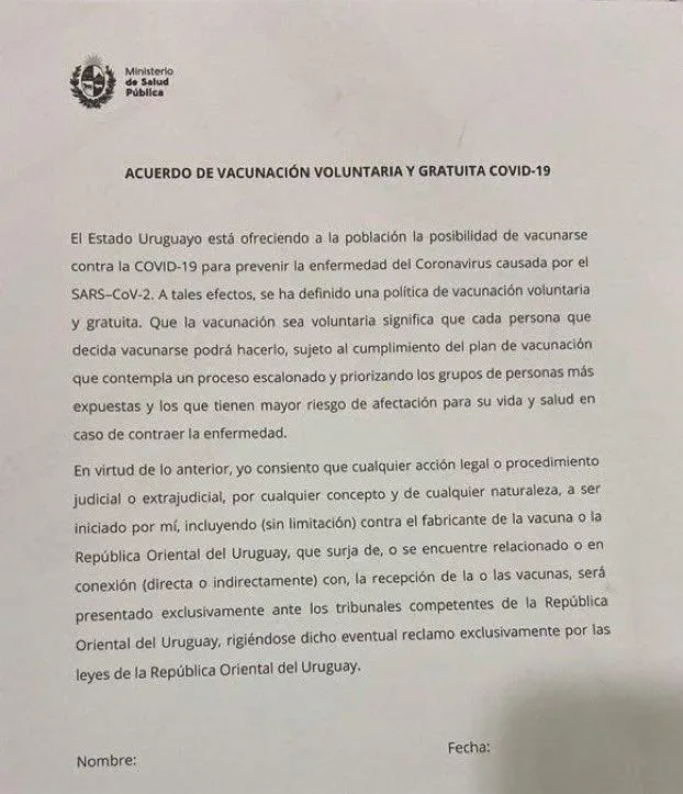 Documento que deberán firmar quienes se vacunen "En virtud de lo anterior, yo consiento que cualquier acción legal o procedimiento judicial o extrajudicial, por cualquier concepto y de cualquier naturaleza, a ser iniciado por mí, incluyendo (sin limitación) contra el fabricante de la vacuna o la República Oriental del Uruguay, que surja de, o se encuentre relacionado o en conexión (directa o indirectamente) con, la recepción de la o las vacunas, será presentado exclusivamente ante los tribunales competentes de la República Oriental del Uruguay, rigiéndose dicho eventual reclamo exclusivamente por las leyes de la República Oriental del Uruguay", finaliza el documento.