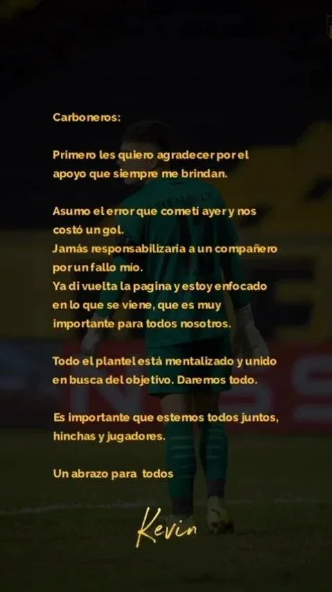 "Carboneros: primero les quiero agradecer por el apoyo que siempre me brindan. Asumo el error que cometí ayer y nos costó un gol. Jamás responsabilizaría a un compañero por un fallo mío. Ya di vuelta la página y estoy enfocado en lo que se viene, que es muy importante para todos nosotros. Todo el plantel está mentalizado y unido en busca del objetivo. Daremos todo. Es importante que estemos todos juntos, hinchas y jugadores. Un abrazo para todos. Kevin".