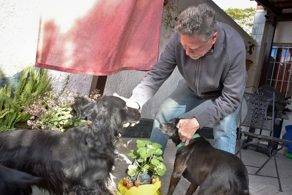 García Pintos no puede caminar tranquilo por su casa. Sus perros, Tomillo y Comino, no se le separan ni un metro y le exigen atención constante. Pese a tener un jardín, los pasea tres veces por día. Hace tareas de jardinería y cultiva sus propias frutillas.