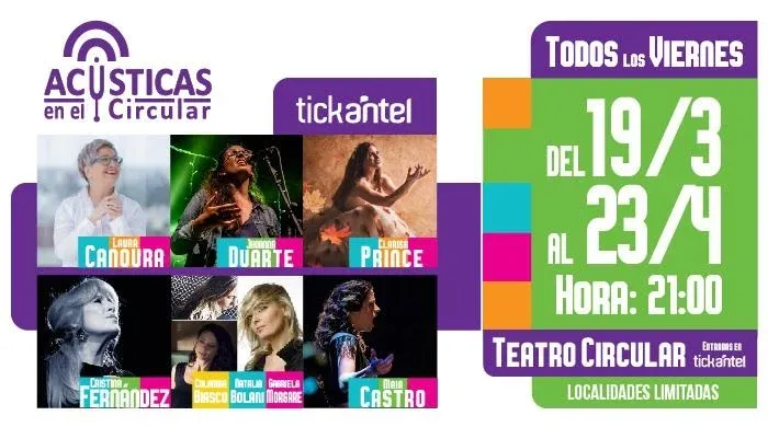 Acústicas. El 19 de marzo comienza este ciclo de mujeres compositoras e intérpretes en un ciclo acústico en el Teatro Circular. Son seis propuestas musicales en formato íntimo para celebrar y poner en valor la creatividad. Laura Canoura, Jhoanna Duarte, Clarisa Prince, Cristina Fernández, Colomba Biasco & Natalia Bolani & Gabriela Morgara y Maia Castro actuarán en vivo cada viernes, pero también será posible verlas por streaming en la plataforma Sala Virtual. Los conciertos serán a las 21 horas y la entradas se compran en Tickantel.