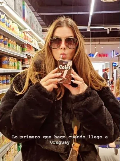De lentes oscuros y con un grueso abrigo negro de piel, la actriz se mostró entre las góndolas de un supermercado con una caja de leche chocolatada Colet en sus manos. "Lo primero que hago cuando llego a Uruguay", escribió junto a la imagen.