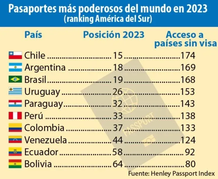 Entre los países de América del Sur, el mejor posicionado es Chile. Su pasaporte es el más “poderoso” de la región, y permite viajar a 174 destinos sin exigencia de visado, con una posición en el puesto 15 del ranking global.