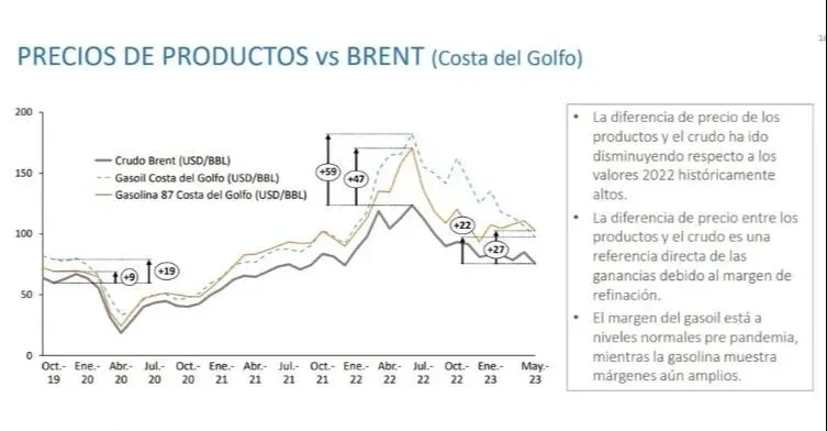 Asimismo, tras registrar valores históricamente altos en 2022, esos márgenes de refinación han comenzado a disminuir. Los números a mayo mostraron que el margen del gasoil estaba en niveles normales de prepandemia (unos US$ 22 por barril), mientras que la gasolina tenía márgenes que todavía se consideran amplios (alrededor de US$ 27 por barril).