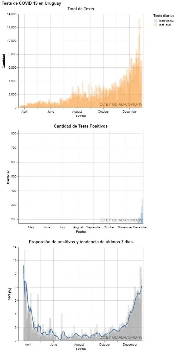 Uruguay tuvo, hasta noviembre, una tasa de positividad que nunca superó el 3%, incluso en octubre, cuando los casos comenzaron a aumentar todos los días. Por otro lado, el día de diciembre con menor tasa de positividad fue el 4, con un 3,8%, aún así lejos del ideal planteado por el referente del GACH.