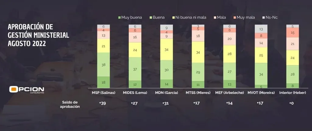 En el último lugar del ranking está el Ministerio del Interior, dirigido por Luis Alberto Heber, con un 36% de aprobación, que contrasta con el mismo porcentaje que la catalogó negativamente.