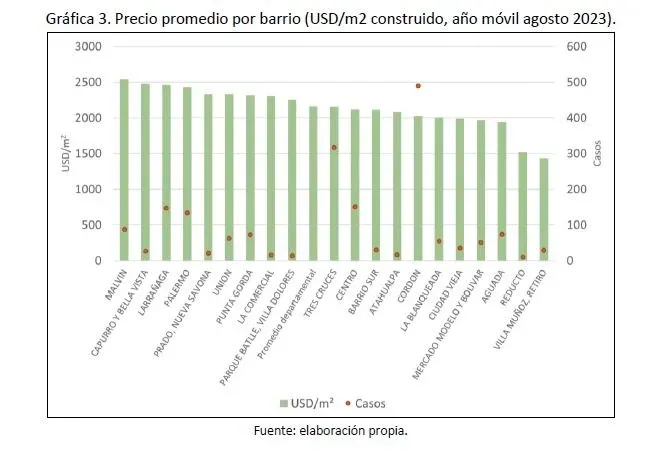 Dentro de Montevideo, el precio por metro cuadrado construido varía según el barrio donde esté ubicada la vivienda. En el año móvil cerrado a agosto el mayor precio se observó en el barrio Malvín, con US$ 2.541, y en segundo lugar, el barrio Capurro-Bella Vista con US$ 2.477 por metro cuadrado construido.