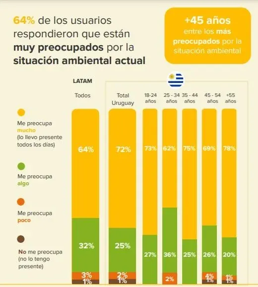 “Uruguay fue el país que estaba por sobre el promedio cuando les preguntamos cuánto les preocupa la situación ambiental actual. Está casi diez puntos por arriba”, dijo a El Observador Katarina Kasdorf, de la consultora de gestión estratégica que trabajó en el estudio, en referencia al 72% de los usuarios que respondieron que estaban muy preocupados por la situación (ver gráfico).