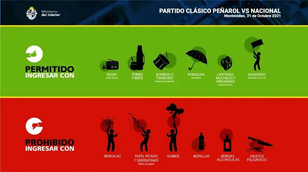 Se pueden entrar radios con pilas chicas, termo y mate, bombos, paraguas y banderas de uno por dos metros, pero no se pueden ingresar bengalas, bombas de humo, papel picado, botellas, bebidas alcohólicas ni objetos peligrosos.