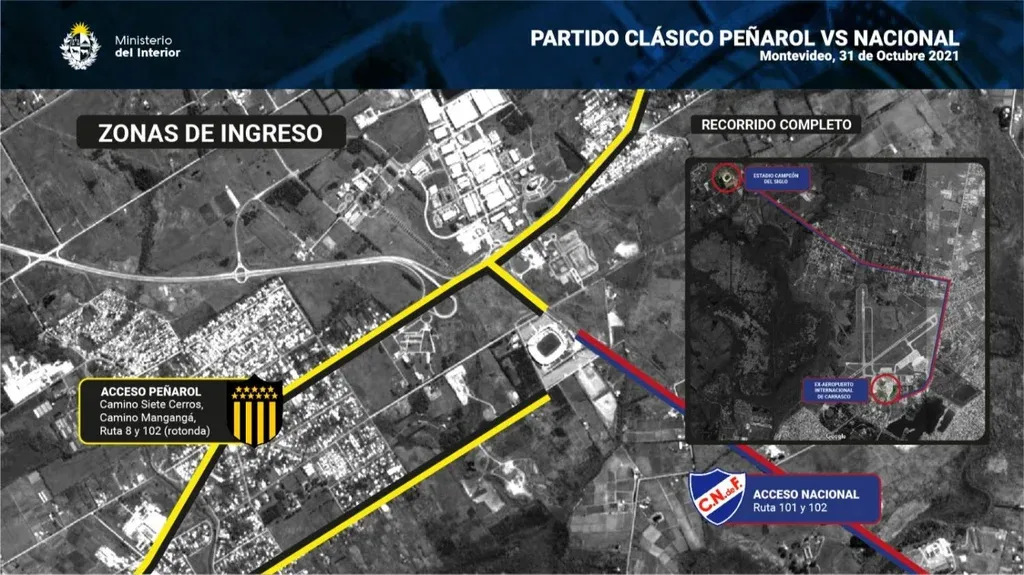 "A la hora 11 comienzan los operativos en la zona del estadio y a la hora 13 será la apertura para los hinchas de Peñarol. Posteriormente, las vías de acceso para las instituciones serán las rutas 101 y 102 para Nacional y las rutas 8 y 102 para Peñarol", agregó Cabral.
