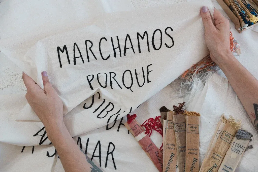 En la ropa o en las banderas, en pancartas y carteles, cada vez hay más bordados en las marchas del 8M. “Yo bordo mis pancartas, me junto con mis amigas antes de ir a la marcha para bordarnos las remeras, es como una reivindicación de la técnica y de nuestra historia”, cuenta Sosa. Destaca también que hay colectivos feministas que arman espacios colectivos y de debate en torno al bordado. “Veo a las pibas con bastidores y una frase bordada y no puedo creerlo. Es histórico", asegura.