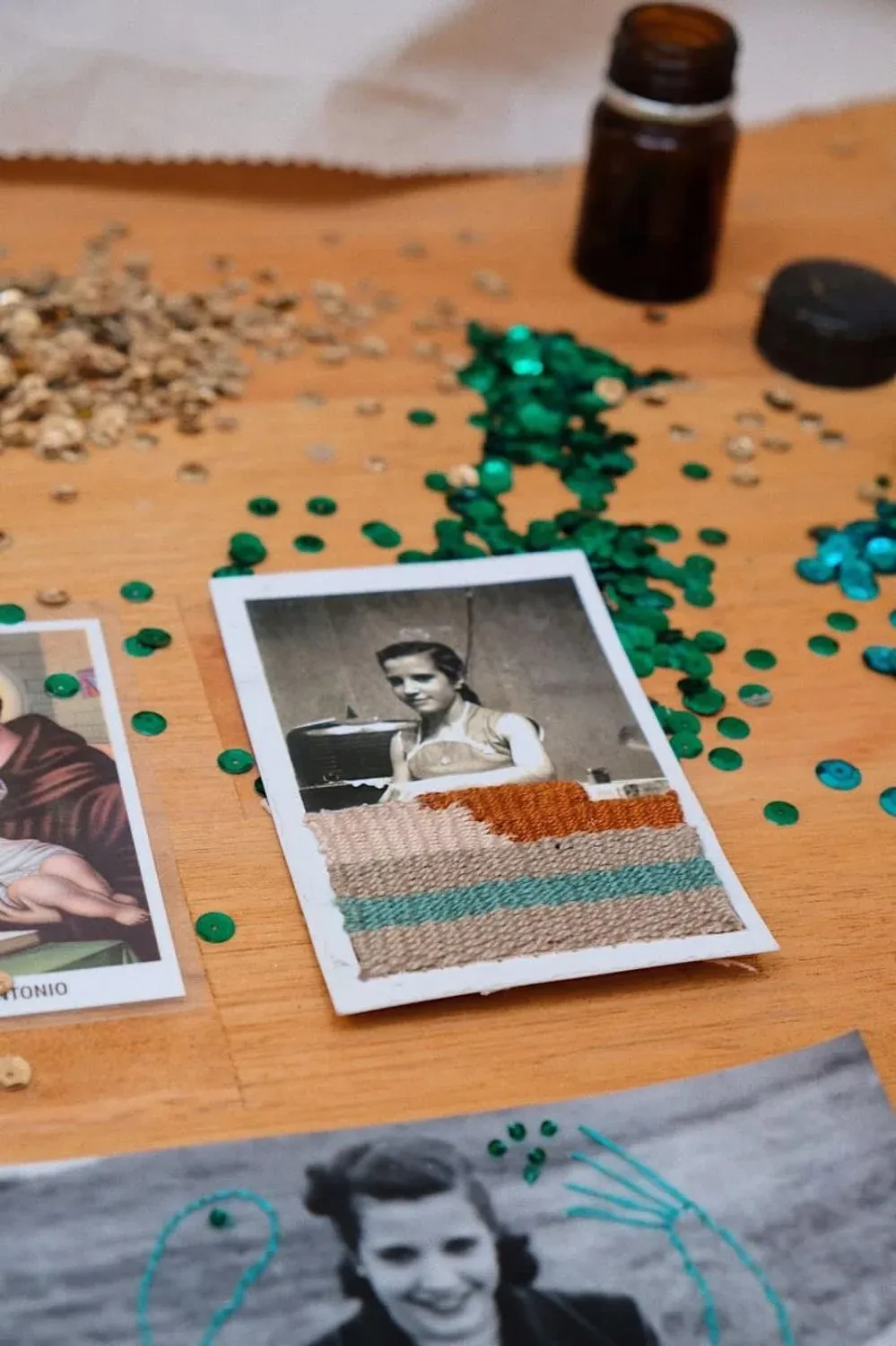 Magdi Molnar Bordado sobre una fotografía de la abuela de Sofía Beceiro Perla y Blanca, las abuelas de Dibarboure, también bordaban. Sus madres les enseñaron a ellas, y ellas sus hijas. "Se corta un poco con la generación de mi madre y conmigo, pero yo lo retomé y empecé a buscar cosas de mis abuelas", cuenta, y considera que es algo que le sucede a muchas bordadoras de su generación.