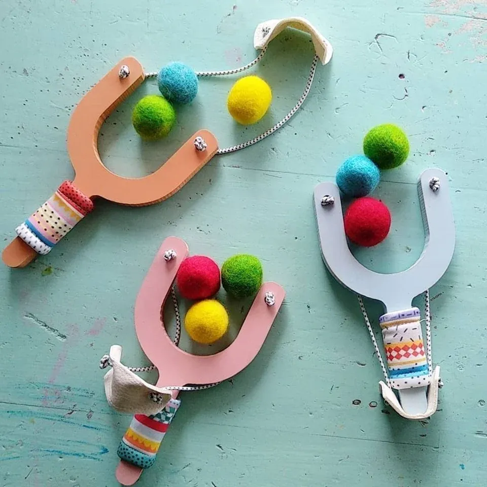 Lanza pompones confeccionados de manera artesanal con fieltro, madera y cuero y está pensado para trabajar la concentración y puntería de los más pequeños sin hacerse daño.