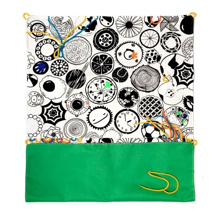 Lona de juego con estímulos para bebés, con superficie de lona de algodón estampada 100% impermeable. Con estímulos táctiles y visuales para que el bebé descubra texturas. Tiene broches fijos de color, apliques de fieltro, cordones y varios dibujos.