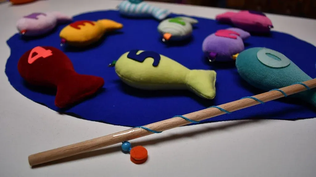 Es un juego de motricidad pensado para los más pequeños. Son pescaditos de tela que el niño debe capturar con una varilla dependiendo de la consigna, que puede ser color o número.