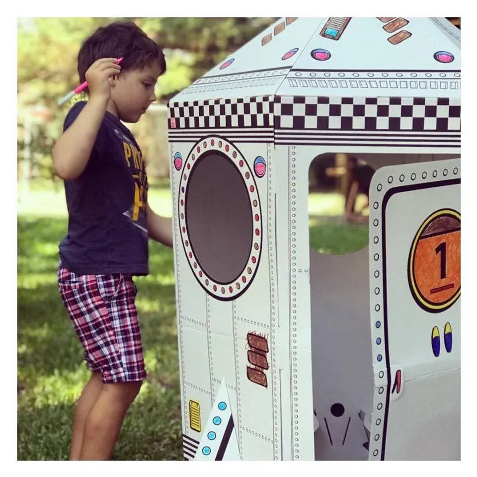 Se trata de una nave espacial tipo cohete hecho con cartón reciclado de alta densidad. Las piezas miden 76 x 83 x 120cm y estan diseñadas para que los niños rellenen los espacios blancos con los colores y diseños que ellos elijan. También hay castillos, fortalezas y hasta un carrito de dos ruedas a escala.