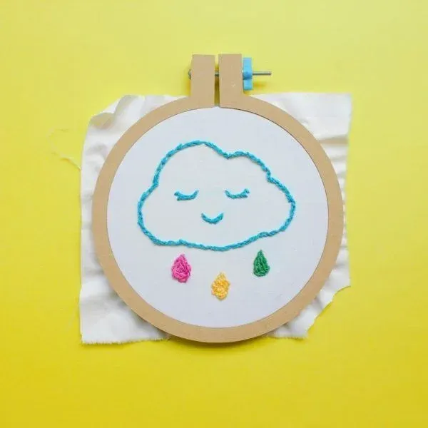 Kit de bordado con materiales y puntos básicos para aprender. Incluye bastidor de madera, tela de algodón, hilos y aguja de metal, hoja con puntos básicos y tres modelos de dibujos para copiar.