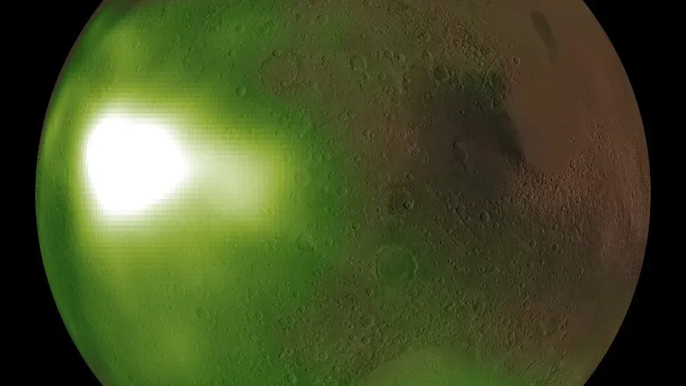 Resplandor nocturno ultravioleta en la atmósfera marciana. La luz ultravioleta no es visible al ojo humano, por lo que la ilustración usa colores falsos verde y blanco. Los colores representan la intensidad de la luz ultravioleta, con los sitios más brillantes en blanco