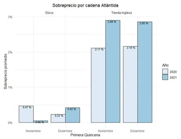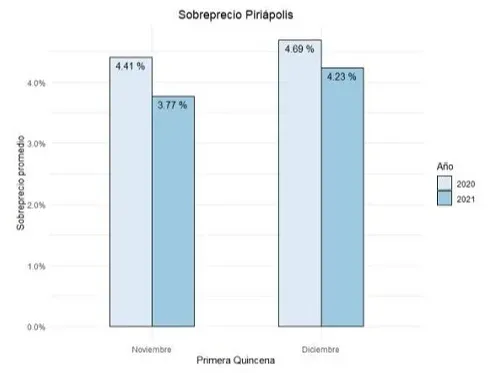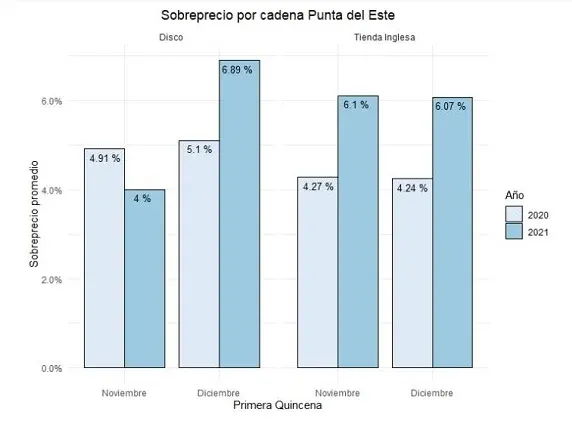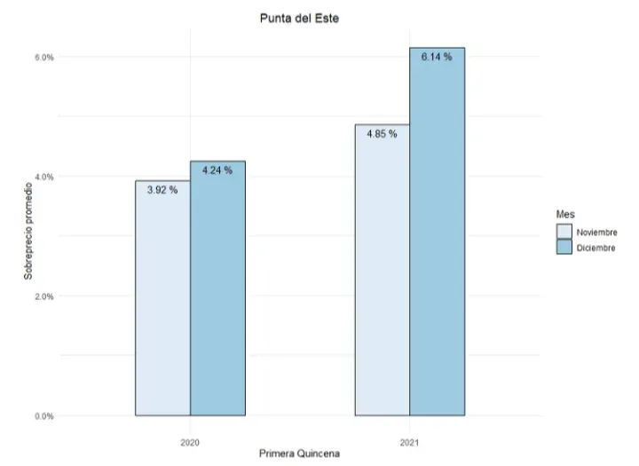 El relevamiento oficial indicó que "el sobreprecio aumenta a medida que nos alejamos de Montevideo, por lo menos hasta Punta del Este" y que es mayor en diciembre que en noviembre. Además, en general, los sobreprecios fueron más pronunciados este año que en los mismos meses de 2020.