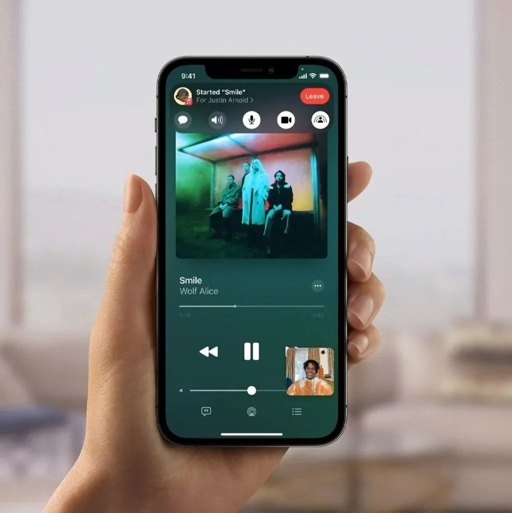 La app de videollamadas suma también SharePlay, que permite compartir elementos durante las videollamadas como música o permitir que dos usuarios vean el mismo video a la vez y sigan viendo al mismo tiempo su reacción con la app, o compartir el video con Apple TV o servicios externos a través del lanzamiento de la API de SharePlay.