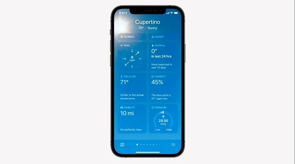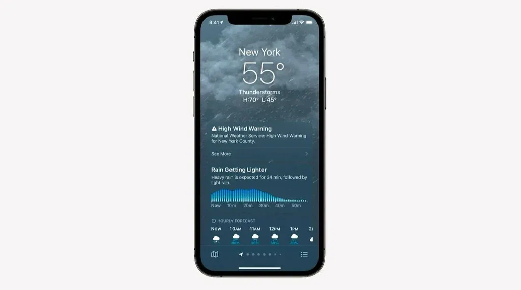 La aplicación de Clima se ha renovado con iOS 15 con nuevos gráficos y diseños según el tiempo meteorológico, así como mapas de pantalla completa en alta definición.