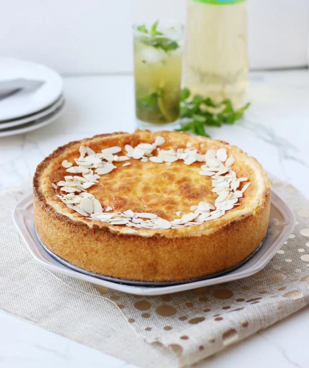 Verter sobre la masa, emparejar la superficie y, si se desea, espolvorear las almendras fileteadas por encima. Llevar al horno por 45 minutos aprox (si ven que se dora demasiado, tapar con aluminio). Su superficie tiene que quedar bien dorada, y el relleno va a lucir un poco líquido. Una vez que se vaya enfriando quedará más firme.