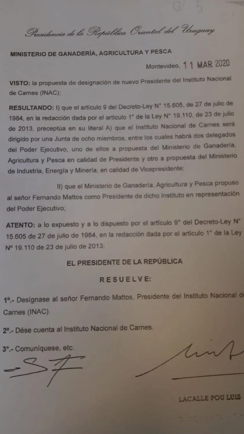 Mattos ocupará la presidencia del instituto cárnico que estaba en manos de Federico Stanham. El Ministerio de Ganadería Agricultura y Pesca (MGAP) –encabezado por otro productor ganadero, Carlos María Uriarte– lo postuló y el presidente de la República, Luis Lacalle Pou, lo designó a través de un documento firmado el miércoles 11 de marzo.