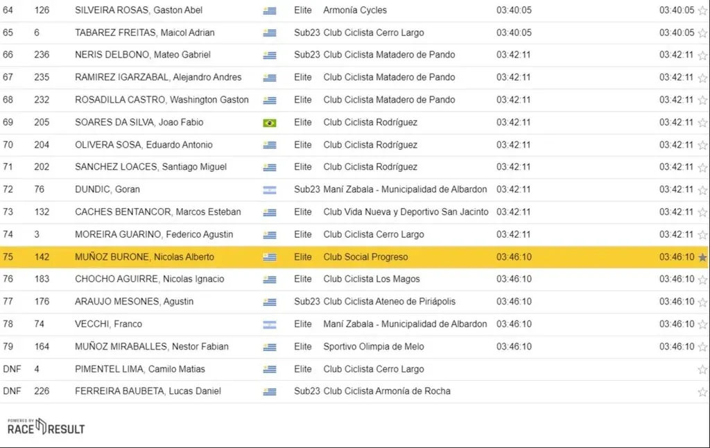 Pero, según la clasificación oficial, el último ciclista en pasar la línea de meta fue Néstor Fabián Muñoz Miraballes, del Olimpia de Melo, quien fue el encargado de “arrancar el año”, según dice el refrán.