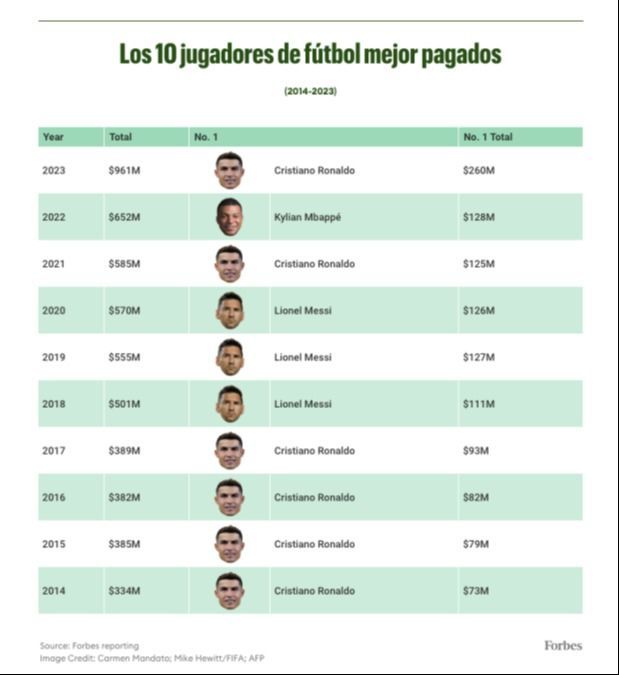 El puesto número 1 lo tiene el portugués Cristiano Ronaldo, de Al Nassr saudí, con US$ 260 millones.
