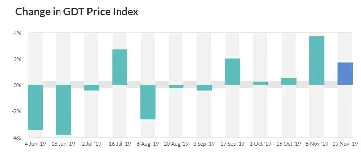 El índice global de precios de los productos lácteos subió por quinta vez en forma consecutiva, esta vez con un alza de 1,7% en relación al evento anterior, en la segunda licitación de noviembre concretada en el marco de los negocios de este martes 19, en el evento N° 248 de la plataforma Global Dairy Trade (Fonterra).