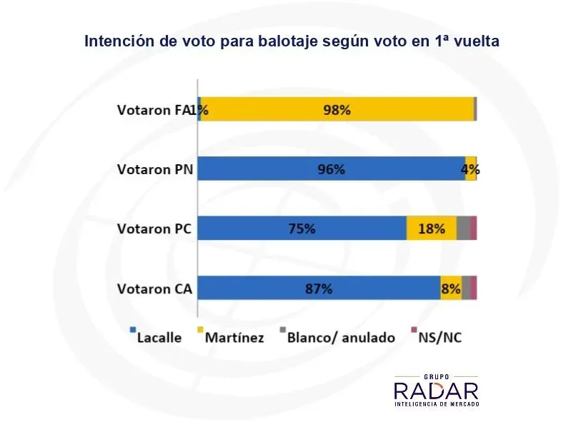 Según la consultora, Lacalle Pou retendrá el 96% de sus votos que obtuvo en octubre y Martínez el 98% de sus apoyos. En tanto, la puja está en los otros partidos opositores. Según Radar, el 75% del electorado colorado seguirá los pasos de su líder, Ernesto Talvi, y votarán al candidato blanco en el balotaje. Mientras, un 18% de los que apoyaron al economista ahora aseguran que darán su voto al candidato frenteamplista. El resto de los votantes colorados de la primera vuelta (7%) afirma que está indeciso o votará en blanco o anulado.