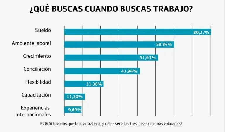 Fundación Telefónica Movistar A la hora de buscar trabajo priorizan por encima de todo el sueldo, pero también les interesa el ambiente laboral, el crecimiento profesional que puedan tener en esa empresa y que les permita lograr un equilibrio entre la vida laboral y la vida personal.