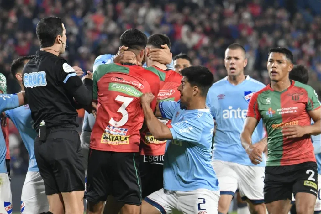 A los 18 minutos, Guzmán Rodríguez saltó con el antebrazo sobre la cabeza de Luis Suárez y el delantero tricolor quedó reclamando falta. Además, en su protesta discutió fuertemente con Rodrigo Pérez.
