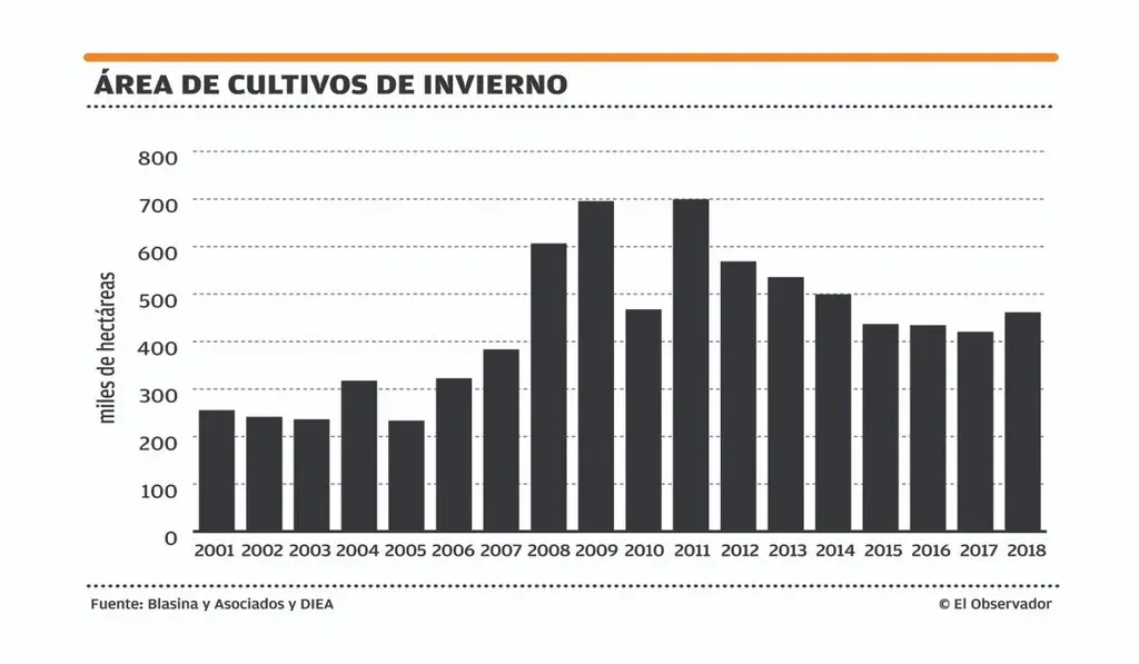 De acuerdo a la Dirección de Estadísticas Agropecuarias (DIEA), el área sembrada de trigo fue de 204.000 hectáreas, casi un 6% más que en la zafra anterior en la que se sembraron 193.000. El área sembrada de cebada cervecera es de 172.000 hectáreas, un 13% más que en 2017 cuando se sembraron 153.000. Es así que se dio un aumento en el área total de cultivos de invierno tras varios años de declive. Este año se sembraron 40.000 hectáreas más que el año pasado, pasando de 419.000 en 2017 a 460.000 en el ciclo que está terminando.
