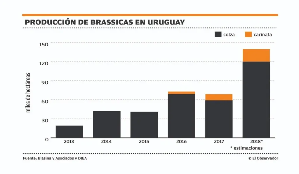 El comienzo de la colza en Uruguay fue promovido por Alcoholes del Uruguay (ALUR) para la generación de biocombustibles, pero el impulso reciente se caracteriza por la incorporación de empresas como Cargill, ADP, Barraca Erro y Kilafen y la concreción de una parte de la superficie por fuera de los contratos con la empresa ALUR que apuntan a la exportación del grano.