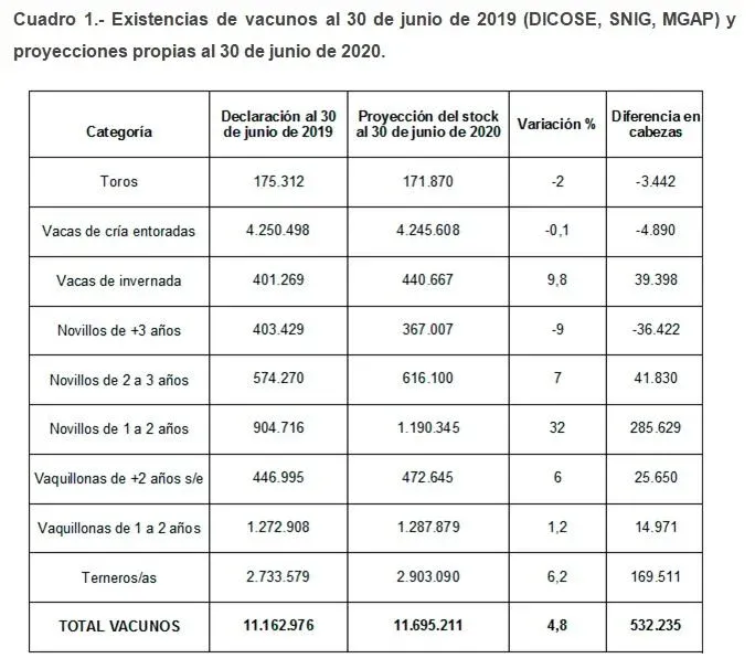 Con todos estos cálculos y supuestos se arriba a un stock que aumentaría unas 500 mil reses, o sea un 4.6% con respecto al 30 de junio de 2019.