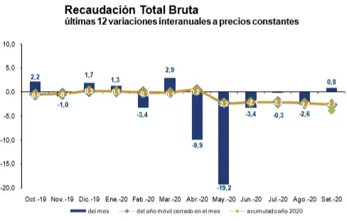 En el acumulado de los últimos 12 meses a setiembre, la recaudación bruta cayó -2,7%. A su vez, la variación interanual del período enero-setiembre 2020 fue de -3,9%, según la DGI.