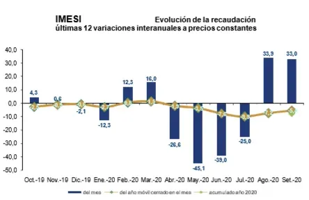 En el caso del IVA (45% del total), la recaudación cayó 2,2% en en setiembre con bajas del 2,2% del IVA interno, el de importaciones (-6,2%) y un incremento de 6,2% el IVA mínimo (pequeñas empresas). Por su parte, el Imesi (12% del total) creció 33% en setiembre con un fuerte dinamismo del Imesi sobre los combustibles (+63,5%), bebidas (+16,7%), tabaco y cigarrillos (+9,6%) y automotores (+2,2%).