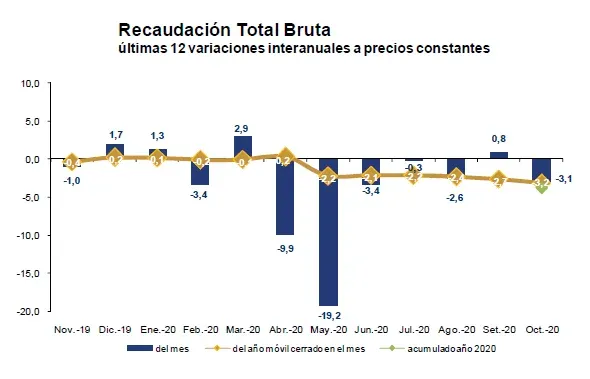 La recaudación total bruta viene mostrando tanto variaciones interanuales positivas como negativas en el período noviembre 2019 - octubre 2020. En el acumulado de los últimos 12 meses la variación interanual fue de -3,2%, y en el mes de octubre 2020 la variación real interanual fue de -3,1%. A su vez, la variación interanual del período enero-octubre 2020 fue de -3,8%, explica el documento difundido por DGI.