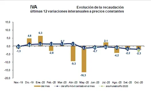 La recaudación del IVA alcanzó los $ 17.351 millones en octubre 2020, representando de esta forma el 44,2% de la recaudación total bruta. En octubre la variación real fue de -2,3% mientras que, la variación real del año móvil cerrado a este mes fue de -2,1%. A su vez, la variación interanual del período enero- octubre 2020 fue de -2,9%.