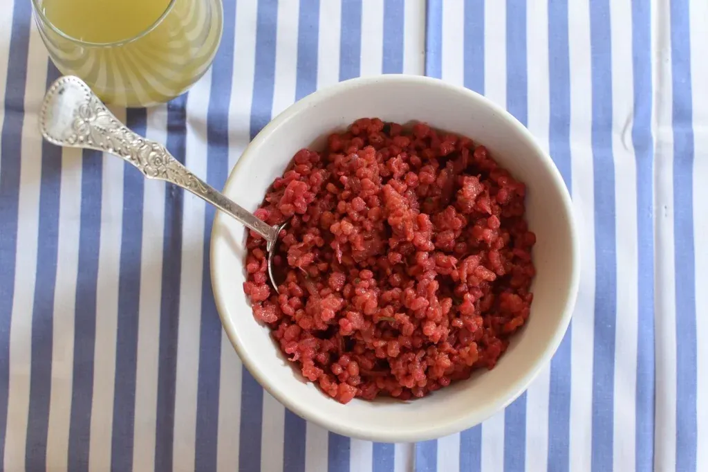 Poné a calentar el oliva en una olla grande; agregá los puerros cuando esté caliente, bajá el fuego y cocinalos a fuego lento: los puerros tienen que quedar tiernos pero no dorados. Agregá la remolacha rallada y cociná revolviendo para que no se pegue. Cuando esté cocida agregá la cebada cruda y mezclá para que los granos se impregnen bien y se mezclen con la remolacha y el puerro que a esta altura tiene que ser más bien una pasta.